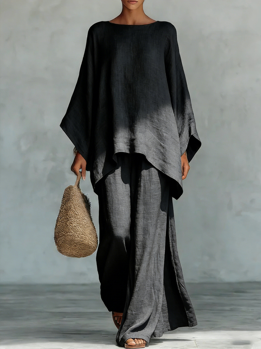 Women's Round Neck Long Sleeve Wide-leg Casual Irregular Hem Two-piece Pants Set